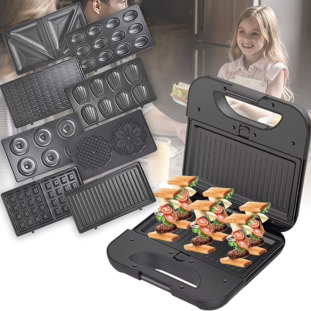 8 в 1: Мультипекар комплектується 8 різними знімними формами, що дає змогу готувати безліч різноманітних страв, включно з вафлями, сендвічами, горішками, пончики та іншими.