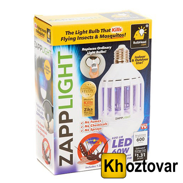 Лампочка-знижувач комарів 2 в 1 ZappLight має форму звичайної лампочки з цоколем. Але не тут те було! Цей прилад здійснює свою роботу в декількох режимах. Виконує функцію світлодіодної лампочки. Кровосмоктувальні комахи тут же гинуть на високовольтній сітці. Пристрій споживає мінімальну кількість електроенергії — всього 10 Вт від мережі 220 В. Захисна площа — 60 квадратних метрів.